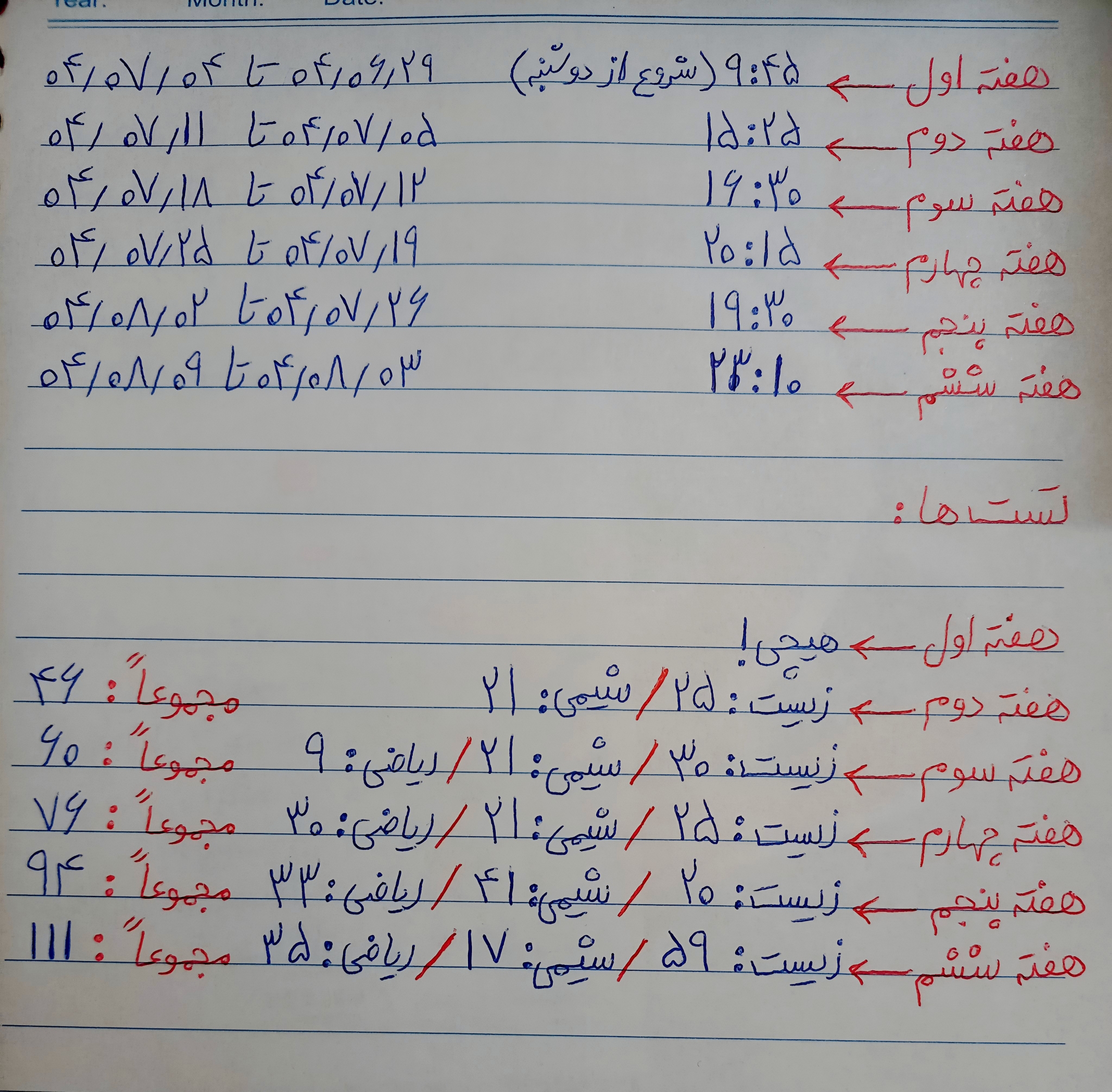 پیشرفت ساعت مطالعه و تعداد تست طی این 6 هفته رو مشاهده میکنین :) . خیلی کار خفنی نکردم ولی با توجه به وضعیتی که درش قرار گرفتم امیدوار کنندست . راستی هفته ششم 23:10 هست . بد خط نوشتم متأسفانه ... تازه خیلی تلاش کردم خوش خط شه 😅 .